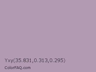 Yxy 35.831,0.313,0.295 Color is a light magenta color and the nearest color is Pastel Purple #b39eb5. Hex code #b29ab3 and RGB value is rgb(178,154,179). In RGB color space, this color is composed of 70% red, 60% green, 70% blue, In CMYK color space, this color is composed of 1% cyan, 14% magenta, 0% yellow , 30% black , In HSL color space, this color has a hue angle of 298° , 14% saturation and 65% lightness.