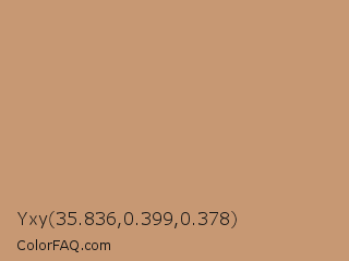 Yxy 35.836,0.399,0.378 Color is a light orange color and the nearest color is Antique Brass #cd9575. Hex code #c79873 and RGB value is rgb(199,152,115). In RGB color space, this color is composed of 78% red, 60% green, 45% blue, In CMYK color space, this color is composed of 0% cyan, 24% magenta, 42% yellow , 22% black , In HSL color space, this color has a hue angle of 26° , 43% saturation and 62% lightness.