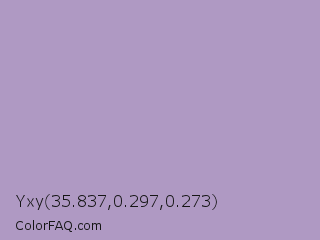 Yxy 35.837,0.297,0.273 Color is a light purple color and the nearest color is East Side #ac91ce. Hex code #af99c3 and RGB value is rgb(175,153,195). In RGB color space, this color is composed of 69% red, 60% green, 76% blue, In CMYK color space, this color is composed of 10% cyan, 22% magenta, 0% yellow , 24% black , In HSL color space, this color has a hue angle of 271° , 26% saturation and 68% lightness.
