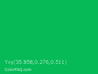 Yxy 35.858,0.276,0.511 Color is a normal green color and the nearest color is GO Green #00ab66. Hex code #06ba57 and RGB value is rgb(6,186,87). In RGB color space, this color is composed of 2% red, 73% green, 34% blue, In CMYK color space, this color is composed of 97% cyan, 0% magenta, 53% yellow , 27% black , In HSL color space, this color has a hue angle of 147° , 94% saturation and 38% lightness.