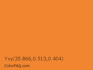 Yxy 35.866,0.513,0.404 Color is a normal orange color and the nearest color is Cadmium Orange #ed872d. Hex code #f28530 and RGB value is rgb(242,133,48). In RGB color space, this color is composed of 95% red, 52% green, 19% blue, In CMYK color space, this color is composed of 0% cyan, 45% magenta, 80% yellow , 5% black , In HSL color space, this color has a hue angle of 26° , 88% saturation and 57% lightness.