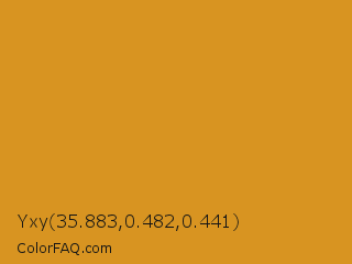 Yxy 35.883,0.482,0.441 Color is a normal orange color and the nearest color is Geebung #d18f1b. Hex code #d89421 and RGB value is rgb(216,148,33). In RGB color space, this color is composed of 85% red, 58% green, 13% blue, In CMYK color space, this color is composed of 0% cyan, 31% magenta, 85% yellow , 15% black , In HSL color space, this color has a hue angle of 38° , 73% saturation and 49% lightness.