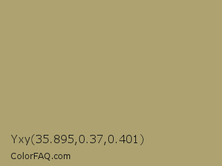 Yxy 35.895,0.37,0.401 Color is a normal yellow color and the nearest color is Green Smoke #a4af6e. Hex code #ada270 and RGB value is rgb(173,162,112). In RGB color space, this color is composed of 68% red, 64% green, 44% blue, In CMYK color space, this color is composed of 0% cyan, 6% magenta, 35% yellow , 32% black , In HSL color space, this color has a hue angle of 49° , 27% saturation and 56% lightness.
