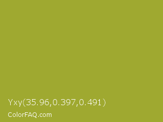 Yxy 35.96,0.397,0.491 Color is a normal yellow color and the nearest color is Citron #9fa91f. Hex code #9fa930 and RGB value is rgb(159,169,48). In RGB color space, this color is composed of 62% red, 66% green, 19% blue, In CMYK color space, this color is composed of 6% cyan, 0% magenta, 72% yellow , 34% black , In HSL color space, this color has a hue angle of 65° , 56% saturation and 43% lightness.