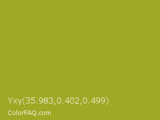 Yxy 35.983,0.402,0.499 Color is a normal yellow color and the nearest color is Citron #9fa91f. Hex code #a0a925 and RGB value is rgb(160,169,37). In RGB color space, this color is composed of 63% red, 66% green, 15% blue, In CMYK color space, this color is composed of 5% cyan, 0% magenta, 78% yellow , 34% black , In HSL color space, this color has a hue angle of 64° , 64% saturation and 40% lightness.