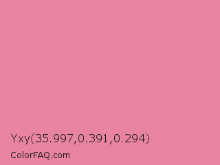 Yxy 35.997,0.391,0.294 Color is a light rose color and the nearest color is Carissma #ea88a8. Hex code #e883a2 and RGB value is rgb(232,131,162). In RGB color space, this color is composed of 91% red, 51% green, 64% blue, In CMYK color space, this color is composed of 0% cyan, 44% magenta, 30% yellow , 9% black , In HSL color space, this color has a hue angle of 342° , 69% saturation and 71% lightness.
