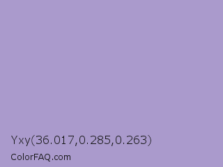 Yxy 36.017,0.285,0.263 Color is a light indigo color and the nearest color is East Side #ac91ce. Hex code #aa9acc and RGB value is rgb(170,154,204). In RGB color space, this color is composed of 67% red, 60% green, 80% blue, In CMYK color space, this color is composed of 17% cyan, 25% magenta, 0% yellow , 20% black , In HSL color space, this color has a hue angle of 259° , 33% saturation and 70% lightness.