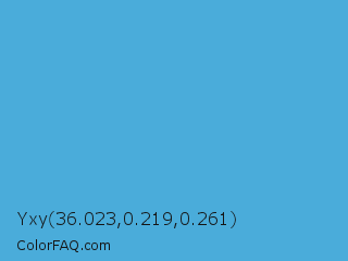 Yxy 36.023,0.219,0.261 Color is a normal blue color and the nearest color is Shakespeare #4eabd1. Hex code #4aacda and RGB value is rgb(74,172,218). In RGB color space, this color is composed of 29% red, 67% green, 85% blue, In CMYK color space, this color is composed of 66% cyan, 21% magenta, 0% yellow , 15% black , In HSL color space, this color has a hue angle of 199° , 66% saturation and 57% lightness.