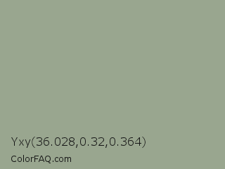 Yxy 36.028,0.32,0.364 Color is a light green color and the nearest color is Lemon Grass #9b9e8f. Hex code #99a68f and RGB value is rgb(153,166,143). In RGB color space, this color is composed of 60% red, 65% green, 56% blue, In CMYK color space, this color is composed of 8% cyan, 0% magenta, 14% yellow , 35% black , In HSL color space, this color has a hue angle of 94° , 11% saturation and 61% lightness.