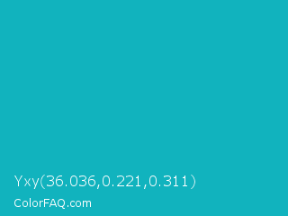 Yxy 36.036,0.221,0.311 Color is a normal cyan color and the nearest color is Tiffany Blue #0abab5. Hex code #11b3be and RGB value is rgb(17,179,190). In RGB color space, this color is composed of 7% red, 70% green, 75% blue, In CMYK color space, this color is composed of 91% cyan, 6% magenta, 0% yellow , 25% black , In HSL color space, this color has a hue angle of 184° , 84% saturation and 41% lightness.