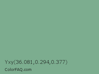 Yxy 36.081,0.294,0.377 Color is a normal green color and the nearest color is Bay Leaf #7da98d. Hex code #7cad8f and RGB value is rgb(124,173,143). In RGB color space, this color is composed of 49% red, 68% green, 56% blue, In CMYK color space, this color is composed of 28% cyan, 0% magenta, 17% yellow , 32% black , In HSL color space, this color has a hue angle of 143° , 23% saturation and 58% lightness.