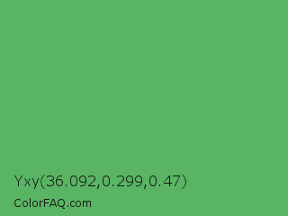 Yxy 36.092,0.299,0.47 Color is a normal green color and the nearest color is Fern #63b76c. Hex code #59b564 and RGB value is rgb(89,181,100). In RGB color space, this color is composed of 35% red, 71% green, 39% blue, In CMYK color space, this color is composed of 51% cyan, 0% magenta, 45% yellow , 29% black , In HSL color space, this color has a hue angle of 127° , 38% saturation and 53% lightness.