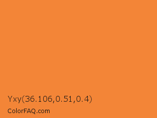 Yxy 36.106,0.51,0.4 Color is a normal orange color and the nearest color is Jaffa #ef863f. Hex code #f38537 and RGB value is rgb(243,133,55). In RGB color space, this color is composed of 95% red, 52% green, 22% blue, In CMYK color space, this color is composed of 0% cyan, 45% magenta, 77% yellow , 5% black , In HSL color space, this color has a hue angle of 25° , 89% saturation and 58% lightness.