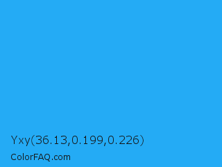 Yxy 36.13,0.199,0.226 Color is a normal blue color and the nearest color is Button Blue #24a0ed. Hex code #24abf5 and RGB value is rgb(36,171,245). In RGB color space, this color is composed of 14% red, 67% green, 96% blue, In CMYK color space, this color is composed of 85% cyan, 30% magenta, 0% yellow , 4% black , In HSL color space, this color has a hue angle of 201° , 91% saturation and 55% lightness.