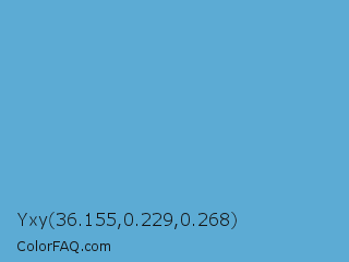 Yxy 36.155,0.229,0.268 Color is a normal blue color and the nearest color is Carolina Blue #56a0d3. Hex code #5cabd4 and RGB value is rgb(92,171,212). In RGB color space, this color is composed of 36% red, 67% green, 83% blue, In CMYK color space, this color is composed of 57% cyan, 19% magenta, 0% yellow , 17% black , In HSL color space, this color has a hue angle of 201° , 58% saturation and 60% lightness.