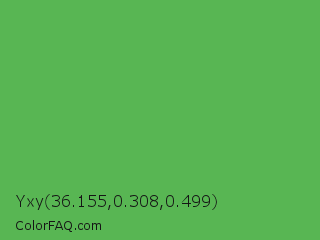 Yxy 36.155,0.308,0.499 Color is a normal green color and the nearest color is Fern #63b76c. Hex code #58b653 and RGB value is rgb(88,182,83). In RGB color space, this color is composed of 35% red, 71% green, 33% blue, In CMYK color space, this color is composed of 52% cyan, 0% magenta, 54% yellow , 29% black , In HSL color space, this color has a hue angle of 117° , 40% saturation and 52% lightness.