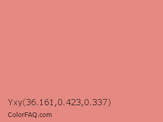 Yxy 36.161,0.423,0.337 Color is a light red color and the nearest color is Light Coral #f08080. Hex code #e58982 and RGB value is rgb(229,137,130). In RGB color space, this color is composed of 90% red, 54% green, 51% blue, In CMYK color space, this color is composed of 0% cyan, 40% magenta, 43% yellow , 10% black , In HSL color space, this color has a hue angle of 4° , 66% saturation and 70% lightness.