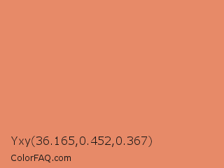 Yxy 36.165,0.452,0.367 Color is a light orange color and the nearest color is Middle Red #e58e73. Hex code #e78a68 and RGB value is rgb(231,138,104). In RGB color space, this color is composed of 91% red, 54% green, 41% blue, In CMYK color space, this color is composed of 0% cyan, 40% magenta, 55% yellow , 9% black , In HSL color space, this color has a hue angle of 16° , 73% saturation and 66% lightness.
