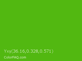 Yxy 36.16,0.328,0.571 Color is a normal green color and the nearest color is Kelly Green #4cbb17. Hex code #52b811 and RGB value is rgb(82,184,17). In RGB color space, this color is composed of 32% red, 72% green, 7% blue, In CMYK color space, this color is composed of 55% cyan, 0% magenta, 91% yellow , 28% black , In HSL color space, this color has a hue angle of 97° , 83% saturation and 39% lightness.