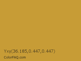 Yxy 36.185,0.447,0.447 Color is a normal orange color and the nearest color is Satin Sheen Gold #cba135. Hex code #c79c36 and RGB value is rgb(199,156,54). In RGB color space, this color is composed of 78% red, 61% green, 21% blue, In CMYK color space, this color is composed of 0% cyan, 22% magenta, 73% yellow , 22% black , In HSL color space, this color has a hue angle of 42° , 57% saturation and 50% lightness.