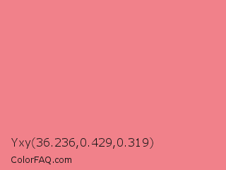 Yxy 36.236,0.429,0.319 Color is a light red color and the nearest color is Light Coral #f08080. Hex code #f1818a and RGB value is rgb(241,129,138). In RGB color space, this color is composed of 95% red, 51% green, 54% blue, In CMYK color space, this color is composed of 0% cyan, 46% magenta, 43% yellow , 5% black , In HSL color space, this color has a hue angle of 355° , 80% saturation and 73% lightness.