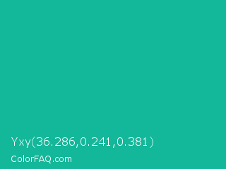 Yxy 36.286,0.241,0.381 Color is a normal cyan color and the nearest color is Mountain Meadow Crayola #1ab385. Hex code #13b799 and RGB value is rgb(19,183,153). In RGB color space, this color is composed of 7% red, 72% green, 60% blue, In CMYK color space, this color is composed of 90% cyan, 0% magenta, 16% yellow , 28% black , In HSL color space, this color has a hue angle of 169° , 81% saturation and 40% lightness.