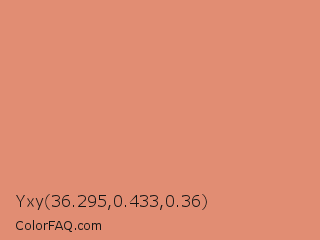 Yxy 36.295,0.433,0.36 Color is a light red color and the nearest color is Middle Red #e58e73. Hex code #e18d73 and RGB value is rgb(225,141,115). In RGB color space, this color is composed of 88% red, 55% green, 45% blue, In CMYK color space, this color is composed of 0% cyan, 37% magenta, 49% yellow , 12% black , In HSL color space, this color has a hue angle of 14° , 65% saturation and 67% lightness.