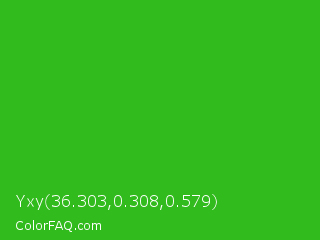 Yxy 36.303,0.308,0.579 Color is a normal green color and the nearest color is Wageningen Green #34b233. Hex code #32bb1c and RGB value is rgb(50,187,28). In RGB color space, this color is composed of 20% red, 73% green, 11% blue, In CMYK color space, this color is composed of 73% cyan, 0% magenta, 85% yellow , 27% black , In HSL color space, this color has a hue angle of 112° , 74% saturation and 42% lightness.
