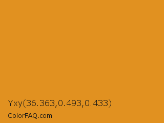 Yxy 36.363,0.493,0.433 Color is a normal orange color and the nearest color is Dixie #e29418. Hex code #e19120 and RGB value is rgb(225,145,32). In RGB color space, this color is composed of 88% red, 57% green, 13% blue, In CMYK color space, this color is composed of 0% cyan, 36% magenta, 86% yellow , 12% black , In HSL color space, this color has a hue angle of 35° , 76% saturation and 50% lightness.