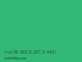 Yxy 36.365,0.267,0.442 Color is a normal green color and the nearest color is Medium Sea Green #3cb371. Hex code #33b879 and RGB value is rgb(51,184,121). In RGB color space, this color is composed of 20% red, 72% green, 47% blue, In CMYK color space, this color is composed of 72% cyan, 0% magenta, 34% yellow , 28% black , In HSL color space, this color has a hue angle of 152° , 57% saturation and 46% lightness.
