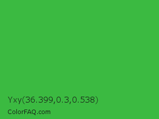 Yxy 36.399,0.3,0.538 Color is a normal green color and the nearest color is Wageningen Green #34b233. Hex code #3bba41 and RGB value is rgb(59,186,65). In RGB color space, this color is composed of 23% red, 73% green, 25% blue, In CMYK color space, this color is composed of 68% cyan, 0% magenta, 65% yellow , 27% black , In HSL color space, this color has a hue angle of 123° , 52% saturation and 48% lightness.