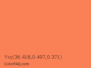 Yxy 36.418,0.497,0.371 Color is a light orange color and the nearest color is Coral #ff7f50. Hex code #fa8055 and RGB value is rgb(250,128,85). In RGB color space, this color is composed of 98% red, 50% green, 33% blue, In CMYK color space, this color is composed of 0% cyan, 49% magenta, 66% yellow , 2% black , In HSL color space, this color has a hue angle of 16° , 94% saturation and 66% lightness.