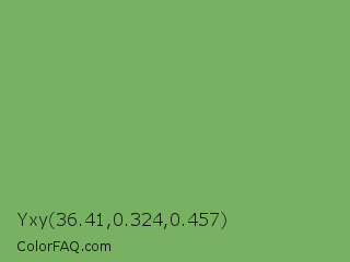 Yxy 36.41,0.324,0.457 Color is a normal green color and the nearest color is Bud Green #7bb661. Hex code #79b163 and RGB value is rgb(121,177,99). In RGB color space, this color is composed of 47% red, 69% green, 39% blue, In CMYK color space, this color is composed of 32% cyan, 0% magenta, 44% yellow , 31% black , In HSL color space, this color has a hue angle of 103° , 33% saturation and 54% lightness.