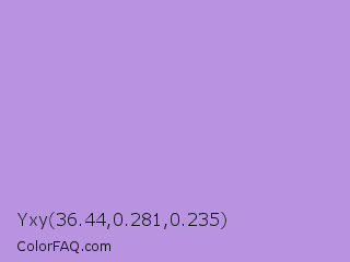 Yxy 36.44,0.281,0.235 Color is a light violet color and the nearest color is Bright Lavender #bf94e4. Hex code #b893e0 and RGB value is rgb(184,147,224). In RGB color space, this color is composed of 72% red, 58% green, 88% blue, In CMYK color space, this color is composed of 18% cyan, 34% magenta, 0% yellow , 12% black , In HSL color space, this color has a hue angle of 269° , 55% saturation and 73% lightness.