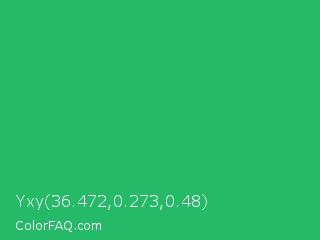 Yxy 36.472,0.273,0.48 Color is a normal green color and the nearest color is Green Crayola #1cac78. Hex code #24ba67 and RGB value is rgb(36,186,103). In RGB color space, this color is composed of 14% red, 73% green, 40% blue, In CMYK color space, this color is composed of 81% cyan, 0% magenta, 45% yellow , 27% black , In HSL color space, this color has a hue angle of 147° , 68% saturation and 44% lightness.