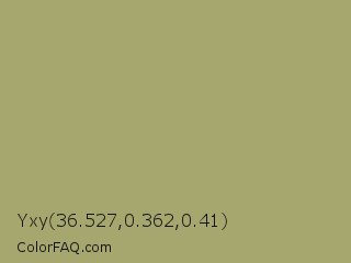 Yxy 36.527,0.362,0.41 Color is a normal yellow color and the nearest color is Green Smoke #a4af6e. Hex code #a6a66f and RGB value is rgb(166,166,111). In RGB color space, this color is composed of 65% red, 65% green, 44% blue, In CMYK color space, this color is composed of 0% cyan, 0% magenta, 33% yellow , 35% black , In HSL color space, this color has a hue angle of 60° , 24% saturation and 54% lightness.