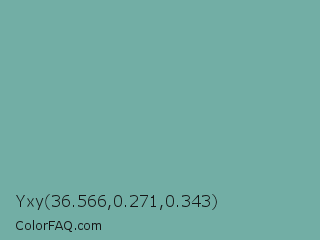 Yxy 36.566,0.271,0.343 Color is a normal cyan color and the nearest color is Green Sheen #6eaea1. Hex code #72aea5 and RGB value is rgb(114,174,165). In RGB color space, this color is composed of 45% red, 68% green, 65% blue, In CMYK color space, this color is composed of 34% cyan, 0% magenta, 5% yellow , 32% black , In HSL color space, this color has a hue angle of 171° , 27% saturation and 56% lightness.