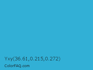 Yxy 36.61,0.215,0.272 Color is a normal blue color and the nearest color is Scooter #2ebfd4. Hex code #31b0d6 and RGB value is rgb(49,176,214). In RGB color space, this color is composed of 19% red, 69% green, 84% blue, In CMYK color space, this color is composed of 77% cyan, 18% magenta, 0% yellow , 16% black , In HSL color space, this color has a hue angle of 194° , 67% saturation and 52% lightness.