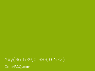 Yxy 36.639,0.383,0.532 Color is a normal lime color and the nearest color is Apple Green #8db600. Hex code #8cb006 and RGB value is rgb(140,176,6). In RGB color space, this color is composed of 55% red, 69% green, 2% blue, In CMYK color space, this color is composed of 20% cyan, 0% magenta, 97% yellow , 31% black , In HSL color space, this color has a hue angle of 73° , 93% saturation and 36% lightness.