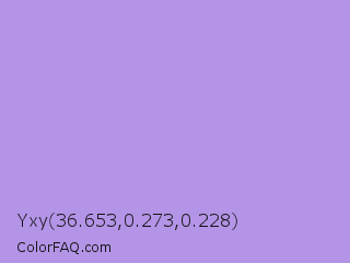 Yxy 36.653,0.273,0.228 Color is a light violet color and the nearest color is Bright Lavender #bf94e4. Hex code #b494e7 and RGB value is rgb(180,148,231). In RGB color space, this color is composed of 71% red, 58% green, 91% blue, In CMYK color space, this color is composed of 22% cyan, 36% magenta, 0% yellow , 9% black , In HSL color space, this color has a hue angle of 263° , 63% saturation and 74% lightness.