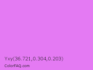 Yxy 36.721,0.304,0.203 Color is a light magenta color and the nearest color is Lavender Magenta #ee82ee. Hex code #e47af3 and RGB value is rgb(228,122,243). In RGB color space, this color is composed of 89% red, 48% green, 95% blue, In CMYK color space, this color is composed of 6% cyan, 50% magenta, 0% yellow , 5% black , In HSL color space, this color has a hue angle of 293° , 83% saturation and 72% lightness.