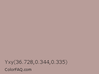 Yxy 36.728,0.344,0.335 Color is a light red color and the nearest color is Thatch #b69d98. Hex code #b89d99 and RGB value is rgb(184,157,153). In RGB color space, this color is composed of 72% red, 62% green, 60% blue, In CMYK color space, this color is composed of 0% cyan, 15% magenta, 17% yellow , 28% black , In HSL color space, this color has a hue angle of 8° , 18% saturation and 66% lightness.