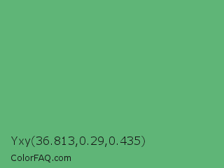 Yxy 36.813,0.29,0.435 Color is a normal green color and the nearest color is Fern #63b76c. Hex code #5fb577 and RGB value is rgb(95,181,119). In RGB color space, this color is composed of 37% red, 71% green, 47% blue, In CMYK color space, this color is composed of 48% cyan, 0% magenta, 34% yellow , 29% black , In HSL color space, this color has a hue angle of 137° , 37% saturation and 54% lightness.