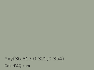 Yxy 36.813,0.321,0.354 Color is a light green color and the nearest color is Dawn #a6a29a. Hex code #9fa695 and RGB value is rgb(159,166,149). In RGB color space, this color is composed of 62% red, 65% green, 58% blue, In CMYK color space, this color is composed of 4% cyan, 0% magenta, 10% yellow , 35% black , In HSL color space, this color has a hue angle of 85° , 9% saturation and 62% lightness.