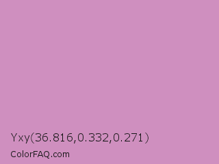 Yxy 36.816,0.332,0.271 Color is a light magenta color and the nearest color is Pastel Violet #cb99c9. Hex code #cf8fbf and RGB value is rgb(207,143,191). In RGB color space, this color is composed of 81% red, 56% green, 75% blue, In CMYK color space, this color is composed of 0% cyan, 31% magenta, 8% yellow , 19% black , In HSL color space, this color has a hue angle of 315° , 40% saturation and 69% lightness.