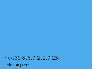 Yxy 36.818,0.212,0.237 Color is a light blue color and the nearest color is Picton Blue #45b1e8. Hex code #4dabed and RGB value is rgb(77,171,237). In RGB color space, this color is composed of 30% red, 67% green, 93% blue, In CMYK color space, this color is composed of 68% cyan, 28% magenta, 0% yellow , 7% black , In HSL color space, this color has a hue angle of 205° , 82% saturation and 62% lightness.