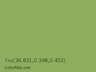 Yxy 36.831,0.348,0.453 Color is a normal green color and the nearest color is Chelsea Cucumber #83aa5d. Hex code #8eae5e and RGB value is rgb(142,174,94). In RGB color space, this color is composed of 56% red, 68% green, 37% blue, In CMYK color space, this color is composed of 18% cyan, 0% magenta, 46% yellow , 32% black , In HSL color space, this color has a hue angle of 84° , 33% saturation and 53% lightness.