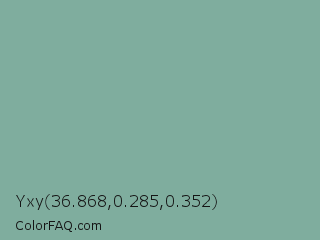 Yxy 36.868,0.285,0.352 Color is a normal green color and the nearest color is Acapulco #7cb0a1. Hex code #7fad9e and RGB value is rgb(127,173,158). In RGB color space, this color is composed of 50% red, 68% green, 62% blue, In CMYK color space, this color is composed of 27% cyan, 0% magenta, 9% yellow , 32% black , In HSL color space, this color has a hue angle of 160° , 22% saturation and 59% lightness.
