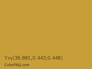 Yxy 36.881,0.443,0.448 Color is a normal orange color and the nearest color is Satin Sheen Gold #cba135. Hex code #c79e38 and RGB value is rgb(199,158,56). In RGB color space, this color is composed of 78% red, 62% green, 22% blue, In CMYK color space, this color is composed of 0% cyan, 21% magenta, 72% yellow , 22% black , In HSL color space, this color has a hue angle of 43° , 56% saturation and 50% lightness.