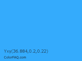 Yxy 36.884,0.2,0.22 Color is a normal blue color and the nearest color is Brilliant Azure #3399ff. Hex code #34abfc and RGB value is rgb(52,171,252). In RGB color space, this color is composed of 20% red, 67% green, 99% blue, In CMYK color space, this color is composed of 79% cyan, 32% magenta, 0% yellow , 1% black , In HSL color space, this color has a hue angle of 204° , 97% saturation and 60% lightness.